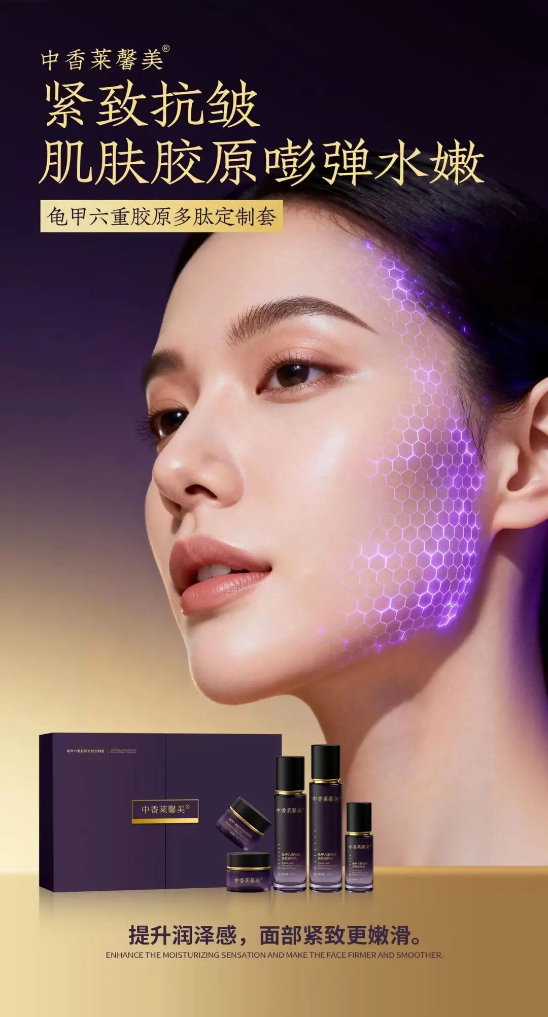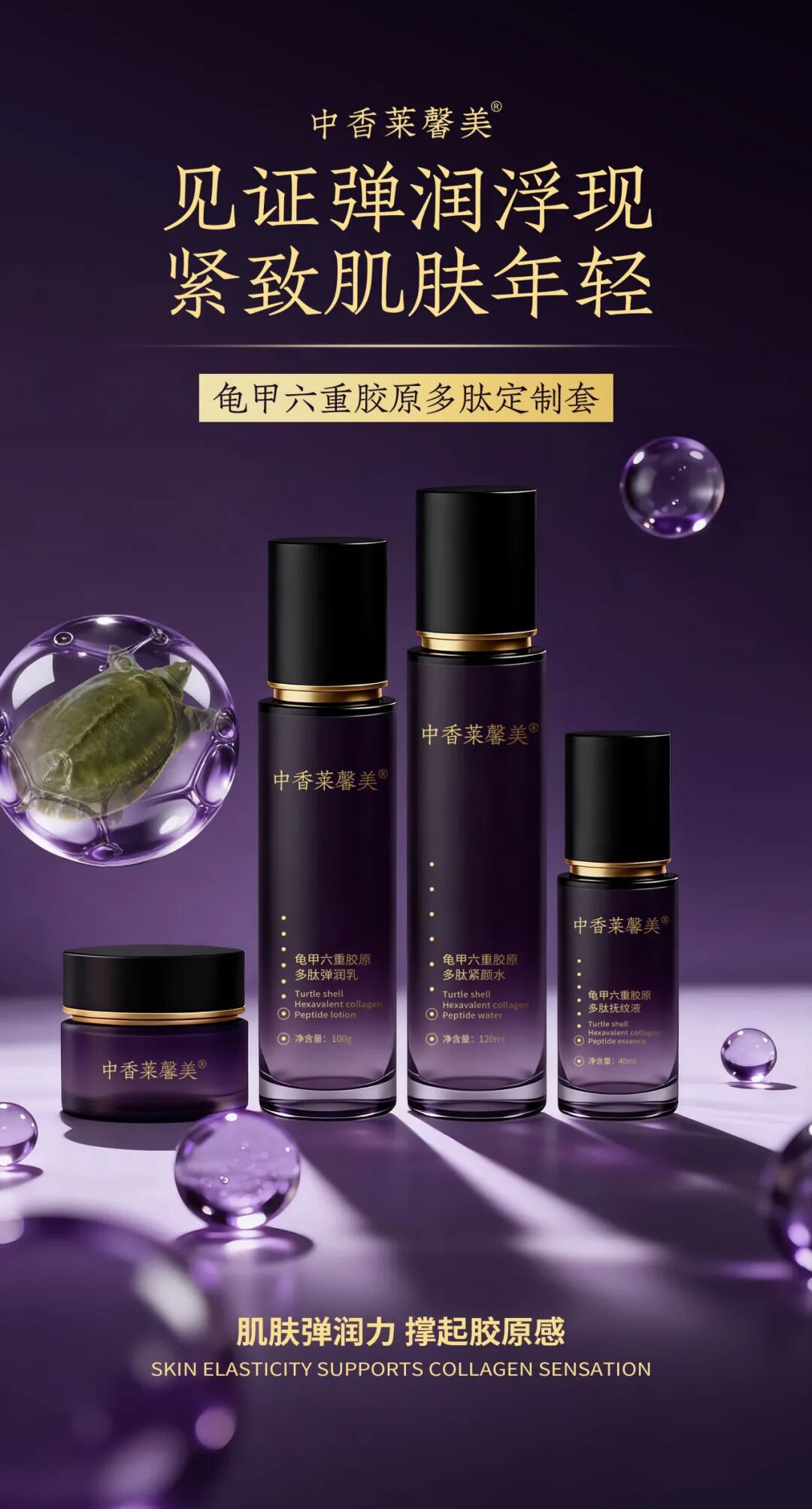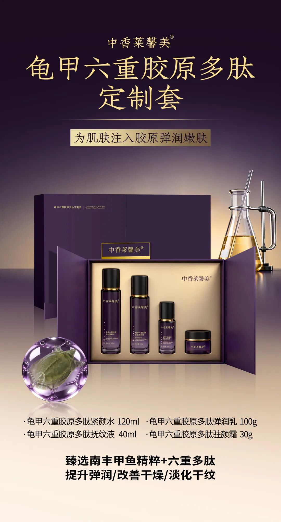 龟甲六重胶原多肽定制套 中香莱馨美龟甲六重胶原多肽定制套,取龟甲精粹,复配六重胶原多肽,将东方智慧与现代科技相融,让岁月的痕迹悄然隐匿,让肌肤由内而外透出年轻亮泽,不负每一份对美的期许,亦不负新年的仪式感。 开启这套专属焕新礼遇,便是开启一场沉浸式的肌肤改善之旅。定制化套组适配不同肌肤的需求,质地轻盈,上脸后能快速缓和肌肤疲惫,让每一次润肤都成为一场悦己时光,卸下一整年的辛苦与疲惫。 无论是熬夜备年货、作息紊乱的新年垮脸党,常年受干燥困扰敏弱肌,初现纹路、追求轻熟肌,还是想要新年焕新颜、精致赴宴的每一位女性,这套定制套组都能适配,新春润肤不打烊,让美丽时刻在线。一套四步,新年不间断守护,日复一日养出弹润透亮的原生少女肌。 我们诚挚邀请追寻年轻与优雅的你,亲身体验中香莱馨美龟甲六重胶原多肽定制套,在温柔守护中邂逅更年轻的自己。新的一年,愿你以自信从容的姿态,奔赴每一场美好相遇,不负时光,不负自己,马年大吉,焕新前行!